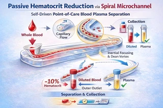 Point-of-care (POC) diagnostic devices have been developing rapidly in recent years, but they are mainly using saliva instead of blood as a test sample. A highly efficient self-separation during the self-driven flow without power systems is desired for expanding the point-of-care diagnostic devices. Microfiltration stands out as a promising technique for blood plasma separation but faces limitations due to blood cell clogging, resulting in reduced separation speed and efficiency. These limitations are mainly caused by the high viscosity and hematocrit in the blood flow. A small increment in the hematocrit of the blood significantly increases the pressure needed for the blood plasma separation in the micro-filters and decreases the separation speed and efficiency. Addressing this challenge, this study explores the feasibility of diluting whole blood within a microfluidic device without external power systems. This study implemented a spiral microchannel utilizing the inertial focusing and Dean vortex effects to focus the red blood cells and extract the blood with lower hematocrit. The inertial migration of the particles during the capillary flow was first investigated experimentally; a maximum of 88% of the particles migrated to the bottom and top equilibrium positions in the optimized 350 × 60 μm (cross-sectional area, 5.8 aspect ratio) microchannel. With the optimized dimension of the microchannel, the whole blood samples within the physiological hematocrit range were tested in the experiments, and more than 10% of the hematocrit reduction was compared between the outer branch outlet and inner branch outlet in the 350 × 60 μm microchannel.