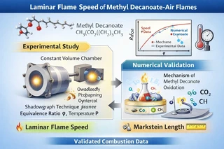 Laminar flame speeds and Markstein lengths of methyl decanoate (MD)-air mixtures were measured within a range of equivalence ratio at different elevated pressures and temperatures using outwardly propagating spherical flames developed inside a constant volume combustion chamber. Shadowgraph technique was employed to observe the temporal evolution of flame fronts. A numerical scheme was used to justify all the experimental data of laminar flame speeds. The numerical scheme was developed based on a short mechanism of methyl decanoate oxidation. A sound agreement was observed between the numerical predictions and experimentally obtained data of laminar flame speeds. Markstein lengths were calculated to quantify the effect of stretch on the flame front at different initial conditions. The study provided viable data of laminar flame speeds and Markstein lengths of methyl decanoate-air flames at different initial conditions which were also well conforming to the established theories of conventional fuels regarding of the effects of equivalence ratio, pressure, and temperature variation on laminar flame speed.