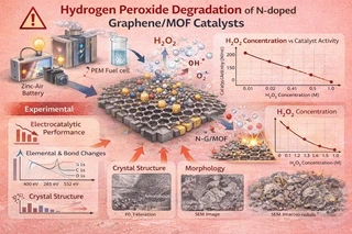 To develop graphene-based nanomaterials as reliable catalysts for electrochemical energy conversion and storage systems (e.g. PEM fuel cells, metal–air batteries, etc.), it is imperative to critically understand their performance changes and correlated material degradation processes under different operational conditions. In these systems, hydrogen peroxide (H2O2) is often an inevitable byproduct of the catalytic oxygen reduction reaction, which can be detrimental to the catalysts, electrodes, and electrolyte materials. Here, we studied how the electrocatalytic performance changes for a heterogeneous nanocatalyst named nitrogen-doped graphene integrated with a metal–organic framework (N-G/MOF) by the effect of H2O2, and correlated the degradation process of the catalyst in terms of the changes in elemental compositions, chemical bonds, crystal structures, and morphology. The catalyst samples were treated with five different concentrations of H2O2 to emulate the operational conditions and examined to quantify the changes in electrocatalytic performances in an alkaline medium, elemental composition and chemical bonds, crystal structure, and morphology. The electrocatalytic performance considerably declined as the H2O2 concentration reached above 0.1 M. The XPS analyses suggest the formation of different oxygen functional groups on the material surface, the breakdown of the material’s C–C bonds, and a sharp decline in pyridinic-N functional groups due to gradually harsher H2O2 treatments. In higher concentrations, the H2O2-derived radicals altered the crystalline and morphological features of the catalyst.